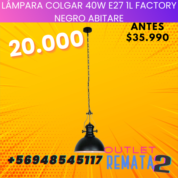 Lámpara colgar 40W E27 1L Factory negro ABITARE