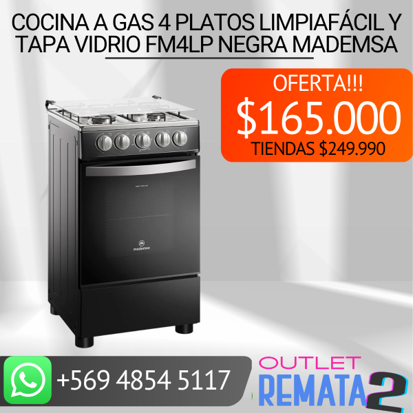 Cocina a Gas 4 Platos LimpiaFácil y Tapa Vidrio FM4LP Negra mademsa