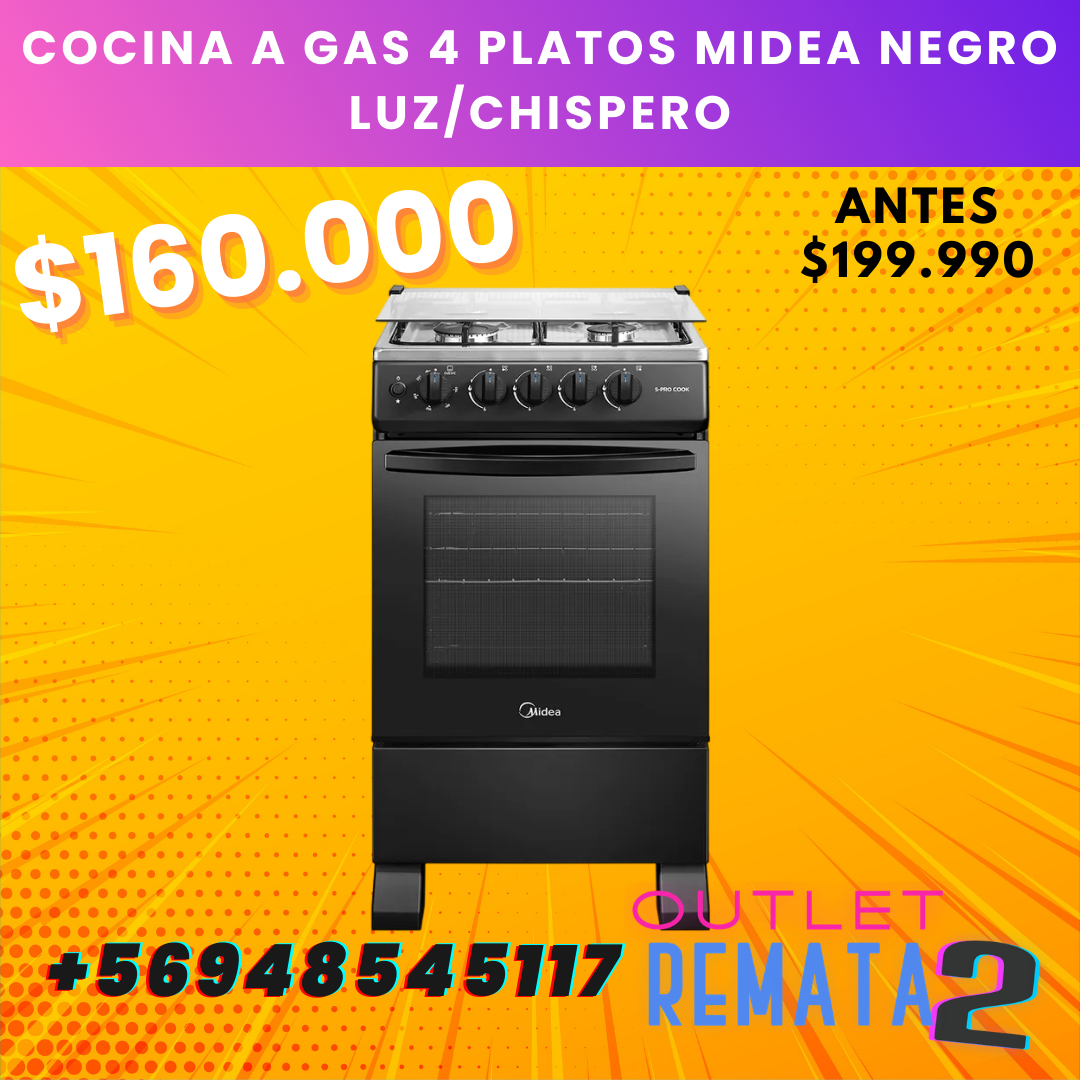 Cocina a Gas 4 Platos Negro midea luz y chispero