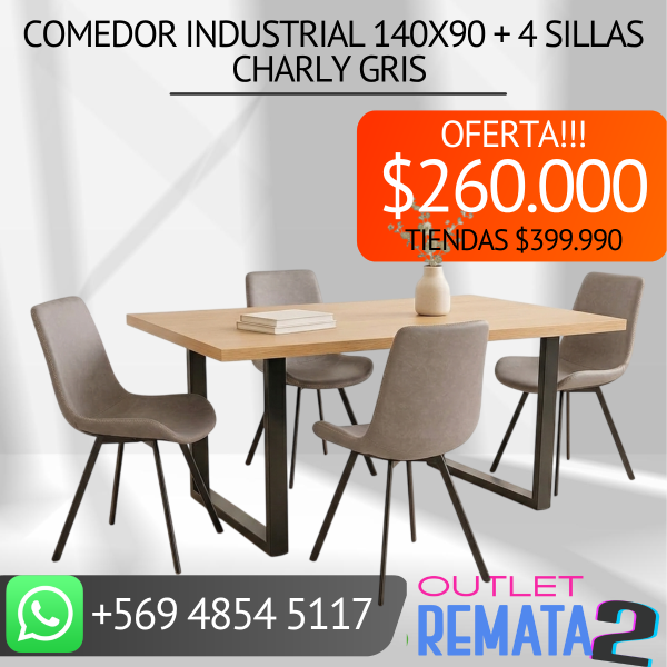 comedor industrial 140x90 + 4 sillas charly gris $399.990 $260.000