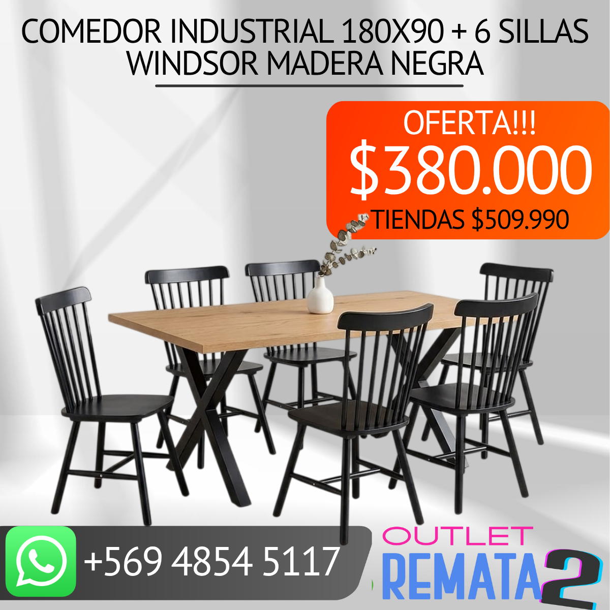 HomeTODOS comedor industrial 180×90 + 6 sillas windsor madera negra