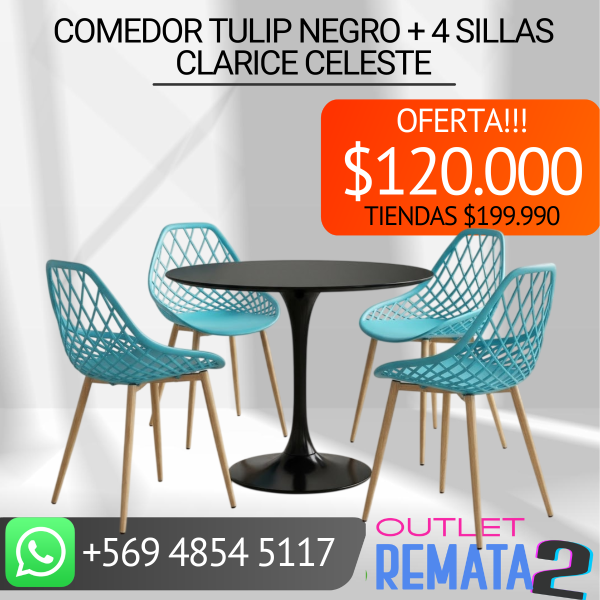 Comedor tulip negro + 4 sillas clarice celeste $199.990 $120.000