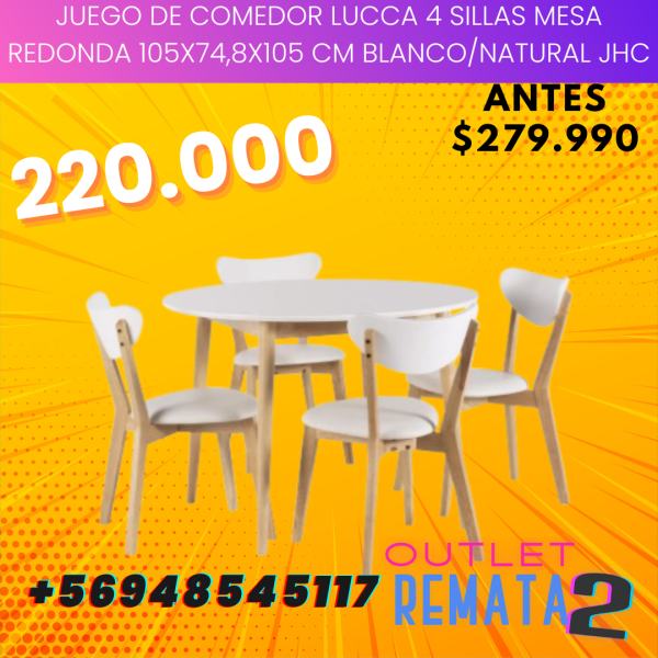 Juego de Comedor Lucca 4 Sillas Mesa Redonda 105x74,8x105 cm Blanco-Natural JHC $279.990 $220.000