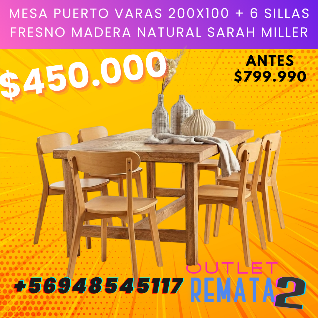 Mesa puerto varas 200×100 + 6 sillas fresno madera natural sarah miller