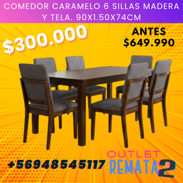 comedor 6 sillas caramelo madera y tela 90X1.50X74CM